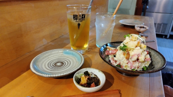お通しの「タコともずくのピリ辛和え」と「厚切りベーコン マッシュポテト」↑