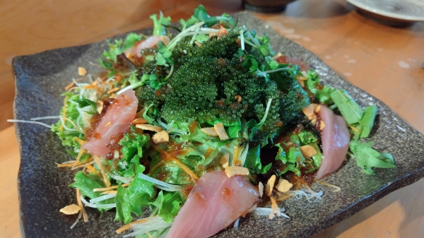 「お刺身サラダ 海ぶどうのっけ/中華ドレッシング」↓