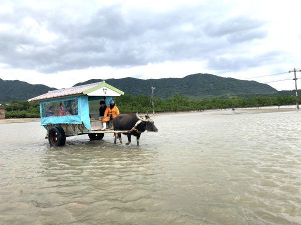 渡るのは満潮になっても水深1mほどにしかならない浅い海で、干潮時にはすっかり潮が引いて歩くこともできます。水牛車は、干潮時はもちろんのこと満潮時でも運行します。水深1mほどなら、水牛はしっかりした足取りで海の中を進むことができます。