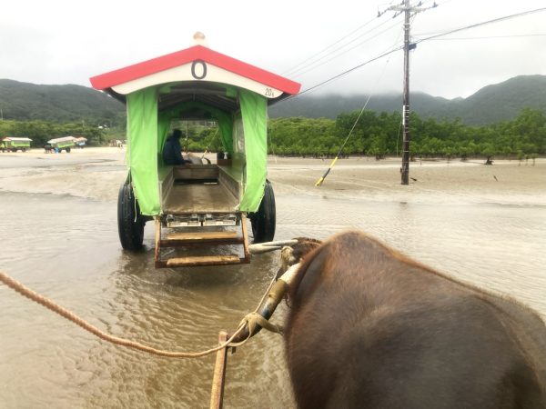 由布島と竹富島では、水牛車のコースに大きな違いがあります。海か、陸かです。