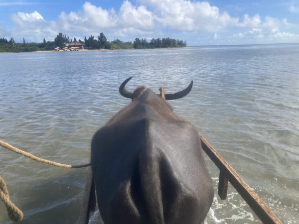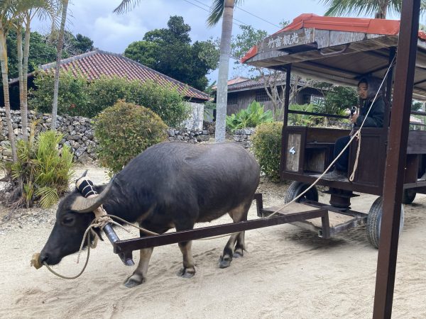 一方竹富島では18人乗りの水牛車が集落を練り歩きます。竹富島でお仕事をしているのはオスの水牛だけなんです。ここも大きな違いですね。