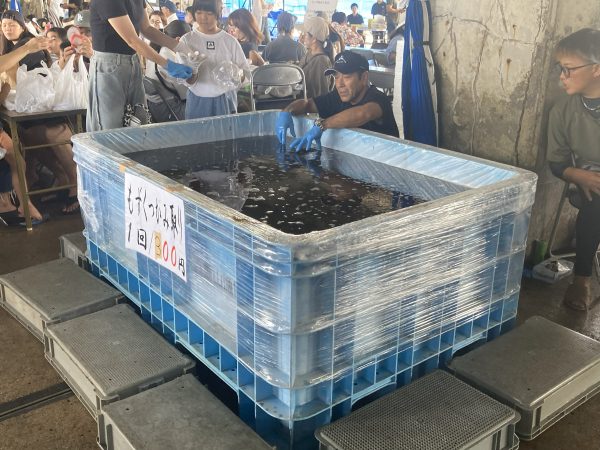 もずくの掴み取り体験も人気で、大行列ができていました!水槽に手を入れてもずくを掴み取るというここでしかできない体験に、子どもだけでなく大人たちもニコニコ笑顔です。