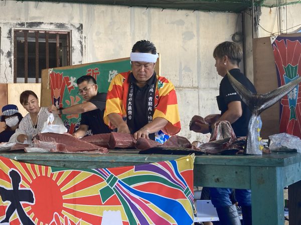 お魚まつりの目玉は、マグロの解体ショー。会場に大きなマグロが丸々1匹運び込まれると、みんなの視線が一斉に集まります。鮮やかな包丁捌きでどんどん切り分けられていく赤身や中トロに、思わず唾を飲み込みます。