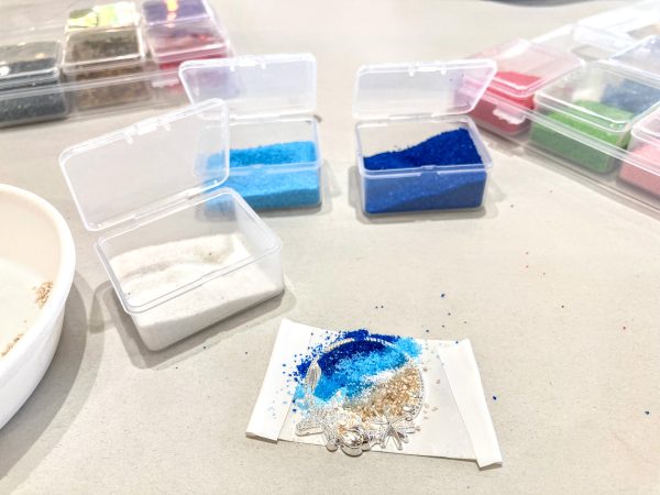 ガラスの砂やかけら、サンゴの砂などで枠の中を自由にデコレーションしていきます。どんなデザインにしようか迷っていたら、スタッフの方が見本を持ってきてくれました。わたしは石垣島の海のようなグラデーションを作りたくて、時間を忘れて試行錯誤してしまいました!