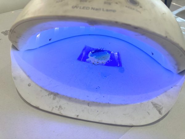 次は、レジン液を使って硬化させていきます。砂が動かないようにそーっと持ち上げて、UVライトの機械の中にセット。60秒間UVを当てたら取り出して、固まっているか確認します。
