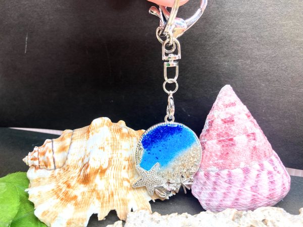 出来上がったら、キーホルダー金具を取り付けます。金具も種類豊富で、シンプルな丸いものから貝殻やイルカ、星や猫の形のものまでありました。金具の形にまでこだわった、オリジナルキーホルダーの完成です!