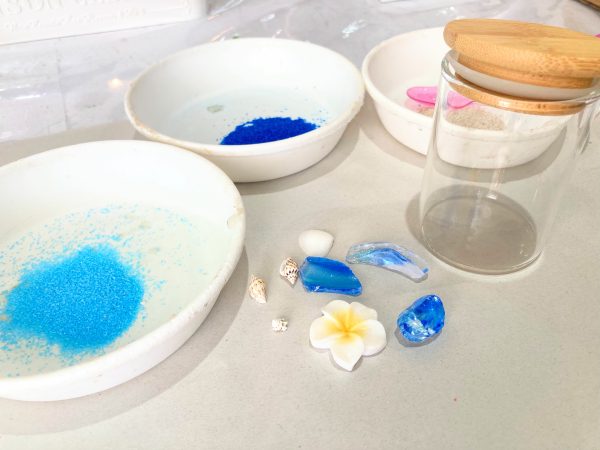 選んだパーツを容器に入れてデコレーションしていきます。底に敷いた砂が見えるでしょうか?サンゴの砂、水色の砂、青い砂の順番で慎重に入れ、きれいなグラデーションができました!夢中になりすぎて、デコレーション中は無言で熱中してしまいました。