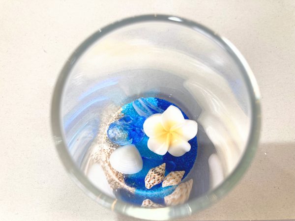 パーツコーナーにはたくさんの色の砂やガラスカレット(かけら)、貝殻、かわいいビーズや小物などが並んでいて、どれにしようかとても悩みます!今回は晴れた日の石垣島の海をイメージしたいのでカラーサンドでグラデーションを作ってみようと思い、3種類の砂をピックアップ。青系の琉球ガラスのかけらと、3種類の貝殻、そして小さなプルメリアのパーツを選びました。どれにしようか選ぶこの時間もわくわくして楽しいです。